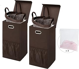 Greenstell ランドリーバスケット 蓋と楕円形のハンドル付き 移動が簡単 折りたたみ式グリッドランドリーバスケット メッシュポケット付き 寝室 洗濯室 バルコニー ブラウン 2個パック