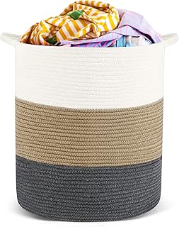 HYNAWIN コットンロープ収納バスケット ランドリーバスケット 背の高い装飾織バスケット ランドリー用 18インチ x 16インチ (オフホワイト/ブラウン/グレー)
