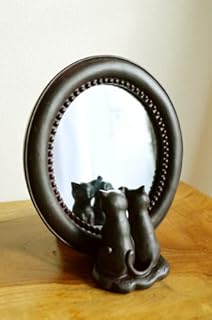 アジアン雑貨 バリ雑貨 ブロンズ調ネコカップルのスタンドミラー 鏡 卓上 ミラー スタンド 置物 オブジェ