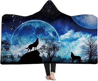 3D オオカミ 月 ツリー プリント フード付きブランケット ウェアラブルブランケット フード ポンチョ フード付きブランケット スロー プラッシュブランケット メンズ レディース スロー シェルパ フリース ソフト 冬 ノベルティ ブランケット ベッド ホーム ソファ 60 x 80インチ