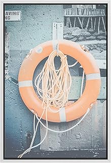 SIGNFORD フレーム入り キャンバスプリント ウォールアート ブライトオレンジ ブイ ライフリング ロープ付き 自然 海 写真 リアリズム ビーチ 風景 カラフル クール リビングルーム 寝室 オフィス用 - 24x36 ホワイト