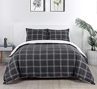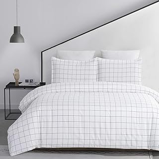 Andency ホワイトグリッド掛け布団セット クイーン (90x90インチ) 3点 (グリッド掛け布団1点 枕カバー2枚) ホワイトとブラック ソフトマイクロファイバー 人工羽毛掛け布団