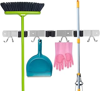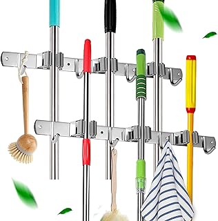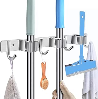 ほうきモップホルダー 壁掛け 高耐久 ステンレススチール 収納ラック 整理ツール キッチン ガーデン ガレージ 浴室 整理 収納 (3クリップ 4フック )