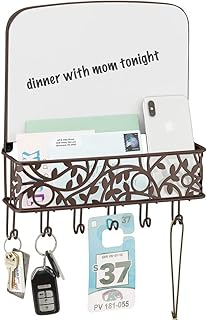 mDesign 金属製 壁取り付け式 玄関 オフィス収納 郵便物バスケット ホワイトボード付き 6フック 手紙/雑誌/鍵/コート/リーシュを収納 つるデザイン ブロンズ