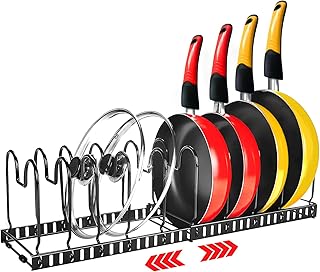 Spardar 鍋とフライパンオーガナイザー 拡張可能なラックフライパンと鍋の蓋オーガナイザー ラックホルダー 10個の調節可能なコンパートメント付き キッチンキャビネット 調理器具ベーキングフライラック