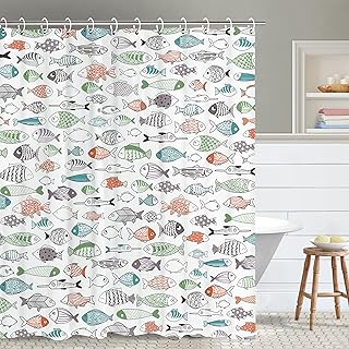 Stacy Fay マルチカラーフィッシュシャワーカーテン 子供用シャワーカーテンセット フック12個付き 防水ポリエステル生地 浴室用カーテン 72 x 84インチ カートゥーン 面白い魚 海洋動物