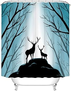 ティールブルー 鹿 シャワーカーテン ファブリック 山の上の鹿の家族 秋冬 森 バスカーテン 鮮やかなカーテン 農家 浴室装飾 フック付き 72インチ×72インチ ブラック