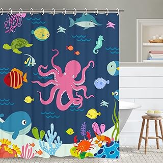 Stacy Fay キッズ シャワーカーテン 海の下 キッズ バスルーム 装飾 漫画 タコ 魚 水中 男の子 女の子 フック付き ネイビーブルー オーシャン 72インチ シャワーカーテン